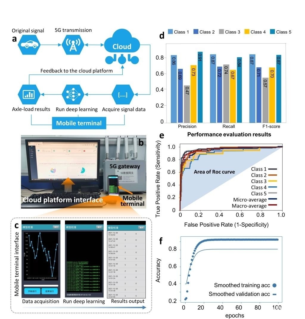 图4.云平台构建和应用构建。a. 应用程序的开发过程。开发过程包括转换TFLite,在Android Studio平台上建立Android项目,生成APK包,安装移动应用。 b. 云平台主页。顶部栏目,系统信息,终端设备数量,APP用户和运行结果。中间,CPU使用率和内存使用率的展示。底部饼状图,不同轴载的车辆数量和各轴载类型的车辆占比。在APP中,可以实时获取车辆轴载信号的分类结果。 d. 模型结果。e. ROC和AUC展示了分类模型的整体性能和每种类型车辆轴载的分类效果。 f. 还展示了训练集和验证集的精度曲线。该模型的最终测试精度达到81.06%。