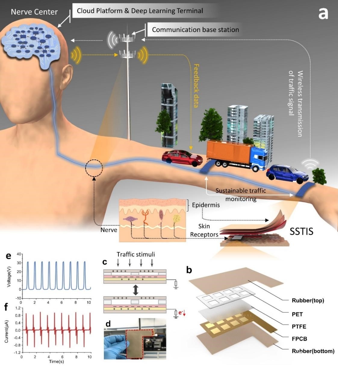 受人体皮肤构造和工作原理启发,曾柱、郑强教授团队基于摩擦纳米发电机技术(TENG)提出了一种自供能的智能交通基础设施仿生电子皮肤系统(SSTIS),从而实现智能城市的可持续实时交通流监测。该系统包括:可方便粘贴在道路表面的自供能、近零功耗柔性传感器、基于人工智能(AI)开发的智能分析系统和基于云平台和Android框架的移动交通信号信息监测反馈系统。该研究也是首次将TENG技术用于真实条件下主干道大规模车辆信息传感,并表现出相当的稳定性、灵敏性和智能性,具有良好的实用价值,有利于构建分布式城市物联网传感系统。