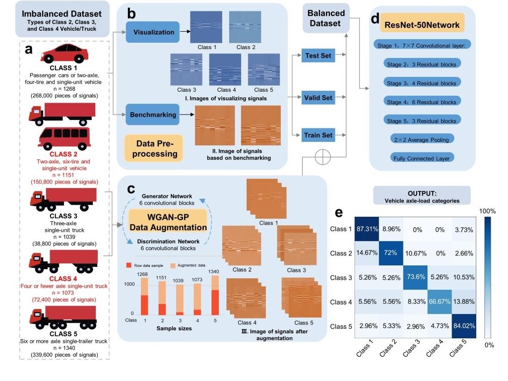 图3.算法分析不同车辆轴重类型的数据分析。a. 手工标记后的不平衡车辆信号数据集(包括670辆乘用车或两轴、四轮胎和单体车辆,377辆两轴、六轮胎和单体车辆,97辆三轴单体卡车,181辆四轴或以下单体卡车和849辆六轴或以上单体卡车)。 b. 信号预处理-可视化和基准测试。c. 由WGAN-GP模型增强的平衡车辆信号数据集(包括1268辆乘用车或两轴、四轮胎和单体车辆,1151辆两轴、六轮胎和单体车辆,1039辆三轴单体卡车,1073辆四轴以下单体卡车和1340辆六轴以上单体卡车)。 d. ResNet-50深度学习算法用于分析不同车辆的轴载类型。训练、验证和测试集的组成(包括5000张训练图像、438张验证图像和433张测试图像)。 e. ResNet-50残余神经网络的每种车辆轴载类型的混淆矩阵。