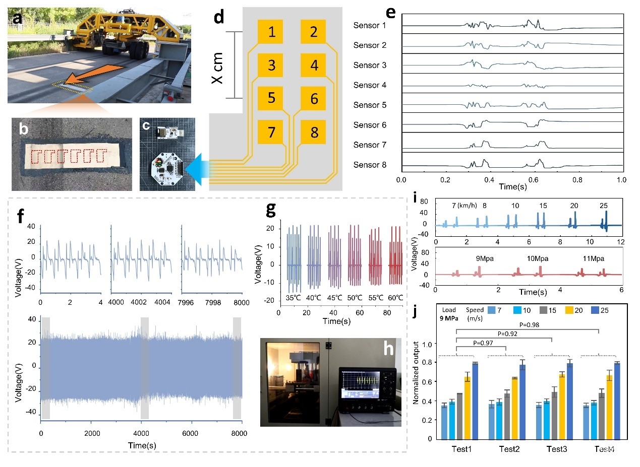 图2.对SSTI系统的测试。a. APT实验装置的图像。 b. 传感器实物的图像。c. 蓝牙模块。 d. e. TENG传感器产生的8组实时车辆信号信息。 f. 实验室的室内疲劳测试结果。传感器在超过10000次的疲劳测试中表现出稳定的输出性能。 g. 环境温度测试的结果。TENG传感器在温度持续变化时输出了稳定的电压结果。 h. 室内疲劳测试的检测仪器。 i. APT测试结果。TENG仿生传感器阵列的输出变化结果随速度和压力条件的变化而变化。 j. TENG传感数据在50次循环测试中的标准化输出。