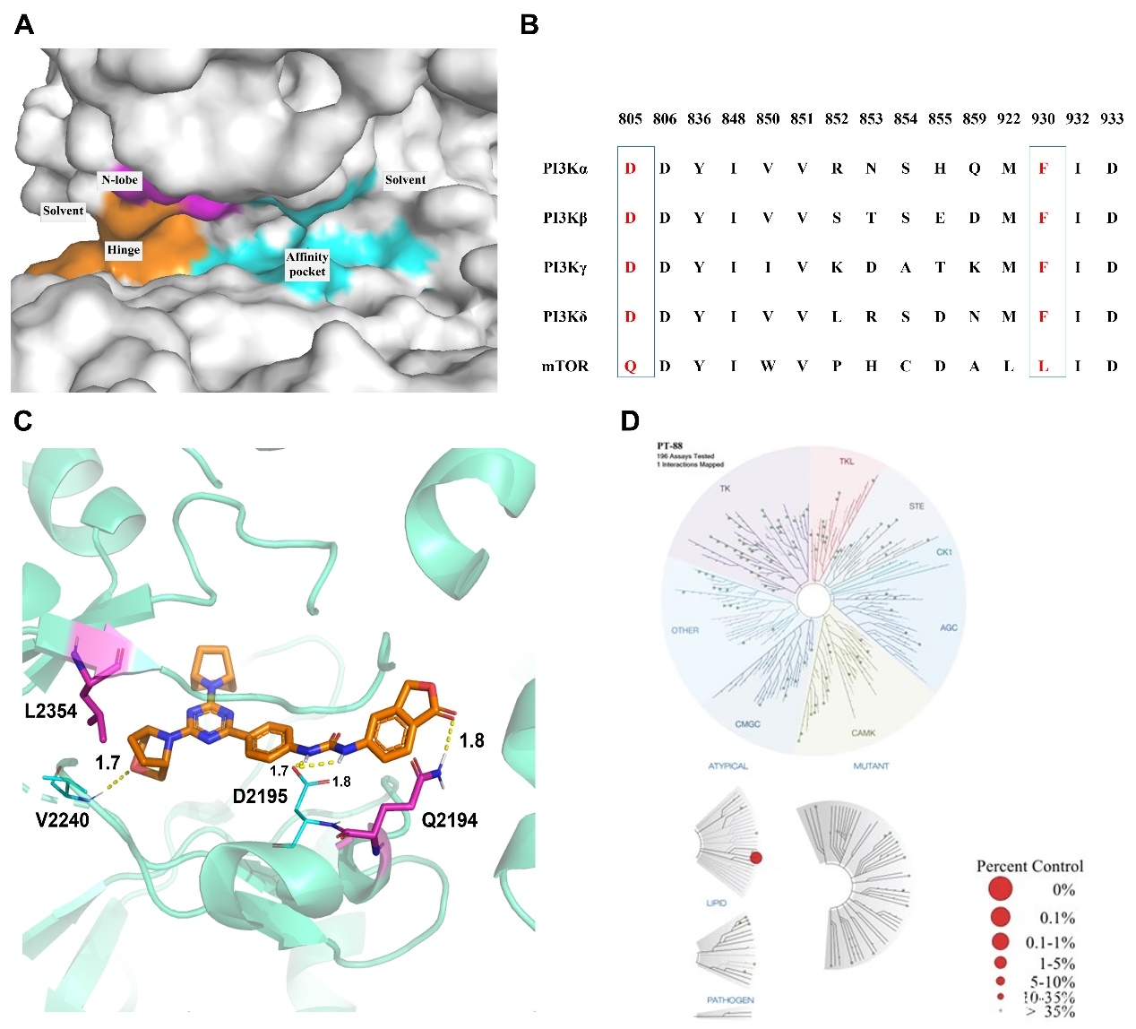 汤磊/张吉泉团队近年的主要研究方向之一是围绕恶性肿瘤及其发病机制,基于PI3K-Akt-mTOR信号通路开展创新药物研究,取得了系列创新性成果(J. Med. Chem.,2016, 59, 7268-7274;Eur. J. Med. Chem.,2020, 204, 112637;Eur. J. Med. Chem.,2022,229, 114055;Bioorg. Chem.,2023, 140, 106781;Eur. J. Med. Chem.,2023,260 115754.)。近期,该团队以泛PI3K/mTOR抑制剂PT-1作为工具分子,根据PI3Ks及mTOR蛋白序列上关键残基的不同,开展理性药物分子设计,经过两轮构效关系研究最终发现了高活性mTOR抑制剂PT-88(IC50:1.2 nM)。激酶谱测试显示(196种激酶),PT-88专一性地结合mTOR,显示出极高的选择性。研究进一步通过分子动力学(MD)、关键残基自由能分解及丙氨酸扫描突变等技术对PT-88的分子结合模式进行了分析。