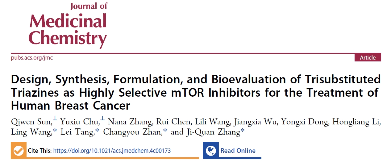 近日,永利官网化学药工程中心汤磊/张吉泉团队在国际知名期刊《Journal of Medicinal Chemistry》(IF: 7.3,药物化学TOP1)上在线发表研究论文“Design, Synthesis, Formulation, and Bioevaluation of Trisubstituted Triazines as Highly Selective mTOR Inhibitors for the Treatment of Human Breast Cancer”。该研究采用基于结构的药物分子设计策略,以三期临床候选药物Gedatolisib(PT-1)为工具分子,通过结构改造筛选出高选择性mTOR抑制剂PT-88,该化合物具有较强的抗乳腺癌活性,有良好的临床开发前景。