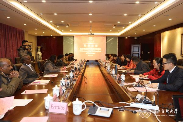 12月7日,厄立特里亚人阵党高等教育部司长卡拉布率厄特教育代表团一行10人来永利官网交流访问。贵州财经大学国际交流合作处处长张毓茜、副处长刘利音,厄特孔子学院中方院长王小华等人员陪同。双方在南校区知雨楼六楼会议室召开座谈会,永利官网副校长黄亚励出席座谈会,党委办公室、校长办公室、教务处、国际交流合作处、基础医学院、公共卫生学院、环境污染与疾病监控教育部重点实验室等相关部门负责人参加会议。