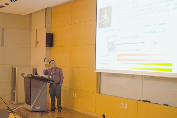 曾柱教授在Biomechanopharmacology: Biomechanics, Biorehology and Pharmacology分会场做了题为“Shear stress: a negative regulator for dendritic cells-induced immune response ?”的学术报告,就生理液流来源的剪切力对树突状细胞免疫学功能的分子调控进行了详细介绍,发现生理液流来源的剪切力很可能是树突状细胞诱导的免疫应答的一个负调控因子,并提出“免疫力学生物学(immunomechanobiology)”和“力免疫学(mechanoimmunology)”的学术观点,得到了国际同行的高度认可。杨晖同学作了题为“Transforming growth factor-beta1 remodels the cytoskeleton organization of mature dendritic cells via smad signaling pathway”的墙报展示。