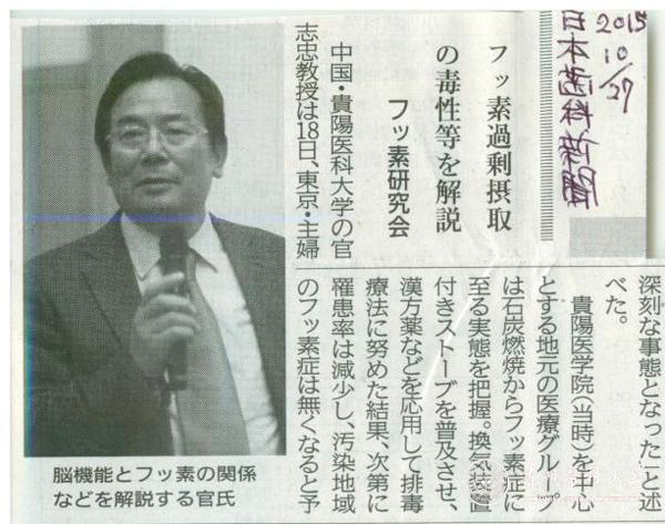 官志忠教授介绍了燃煤污染型地氟病的流行病学特点、多系统损害改变、分子发病机制、综合治理后病区人群健康好转状况、临床治疗及药物开发等;并重点介绍了永利官网氟研究领域取得的成果,得到参会氟研究专家的高度认可,提升了永利官网氟研究团队的国际影响。日本牙科新闻报刊对官教授的讲学作了专题报道。