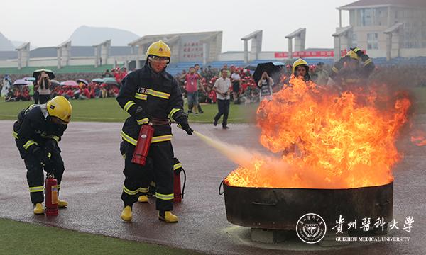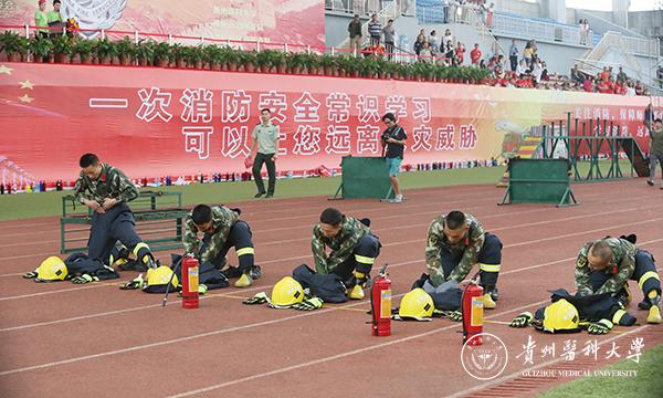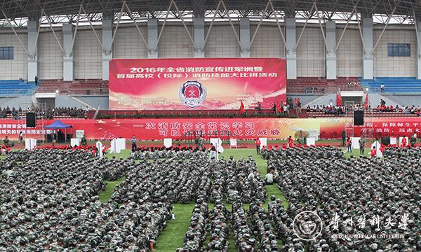 9月13日下午,由省教育厅、省军区司令部、省消防总队联合主办,贵安新区管委会、77779193永利官网、贵阳市消防支队、贵安新区消防支队承办的贵安新区大学城2016年全省消防宣传“进军训”暨首届高校(校际)消防技能大比拼活动在永利官网南校区体育场进行。