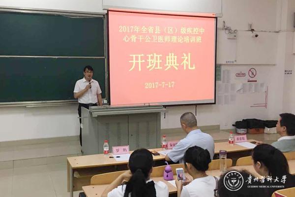 7月17日,由贵州省卫生与计划生育委员会主办,永利官网公共卫生学院承办的“贵州省县(区)级疾控中心骨干公卫医师培训班”开班典礼在北校区科技大楼4101教室举行,来自全省各县(区)级疾控中心的骨干公卫医师160余人参加了培训。贵州省卫生计生委副主任朱征明、永利官网副校长罗鹏、省卫生计生委疾控处副处长潘忠伦、永利官网教务处处长温小军、永利官网公共卫生学院党委书记杨光红、公共卫生学院院长洪峰及培训班教师代表出席了开班典礼。