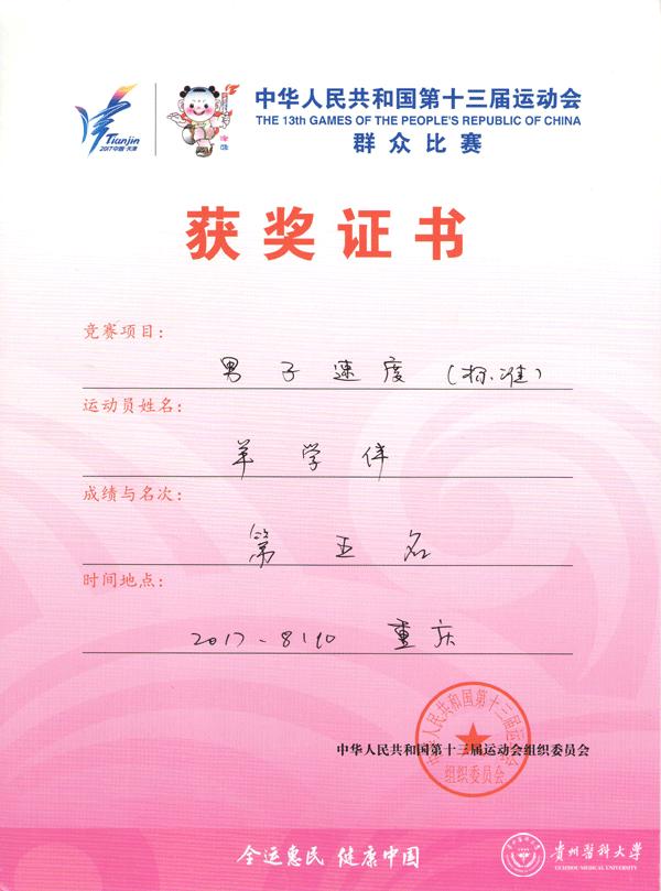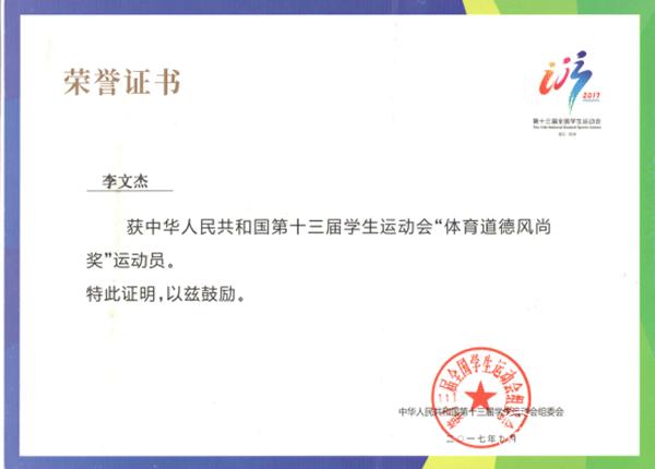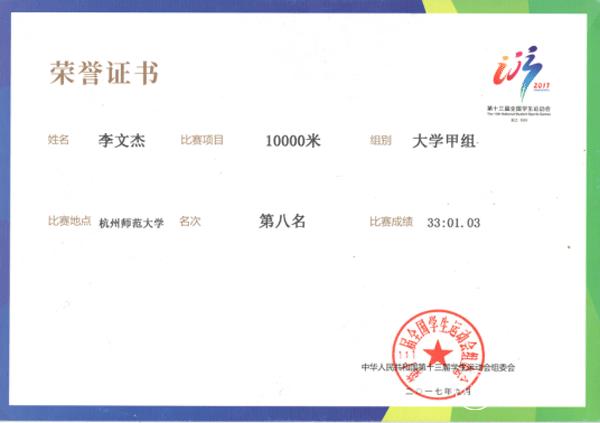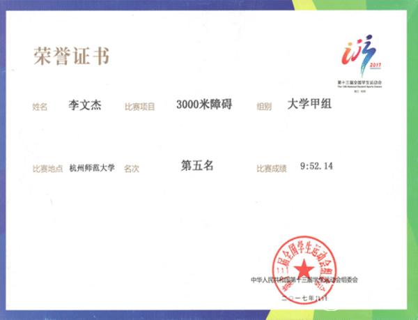 9月3日,第十三届全国学生运动会在杭州举行。9月11日晚上七点,大学男子甲组万米决赛中,永利官网运动与健康学院2014级休闲体育专业学生李文杰,获得第八名;9月12日晚七点,大学男子甲组三千米障碍赛决赛中,李文杰同学取得第五名的好成绩,再次为贵州代表团争得了田径项目的荣誉,他个人也获得“体育道德风尚”运动员荣誉称号。