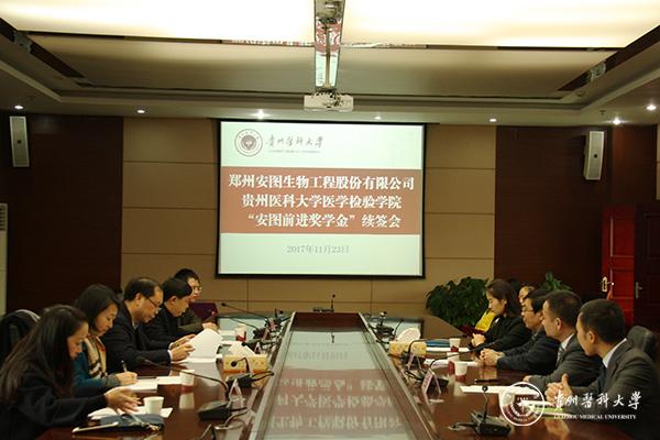 11月23日,安图前进奖学金续签仪式在永利官网举行。全国政协委员、农工党河南省委专职副主委花亚伟、安图生物公司营销总监谢雷震,校党委书记林昌虎,农工党贵州省委副主委、贵州省卫生发展研究院常务副院长喻国冻,校党办、医学检验学院等负责人出席仪式。