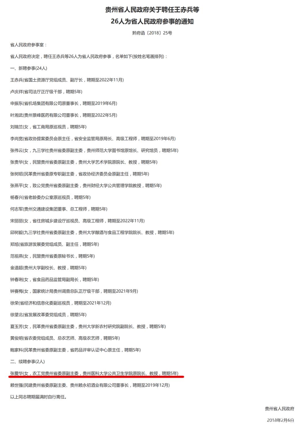 2月6日,贵州省人民政府发布《贵州省人民政府关于聘任王赤兵等26人为省人民政府参事的通知》(黔府函〔2018〕25号)。永利官网环境污染与疾病监控教育部重点实验室主任、贵州省卫生发展研究院院长张爱华教授续聘为省人民政府参事,聘期5年。