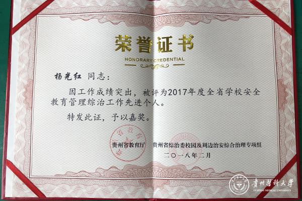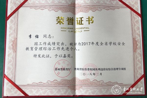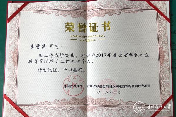 近日,经省教育厅、省综治委校园及周边治安综合治理专项组考核审议,永利官网以98.60分的成绩荣获“2017年度学校安全稳定综治工作先进单位”。同时,因工作成绩突出,永利官网公共卫生学院党委书记杨光红、保卫处办公室副主任李佑、学生处思政科副科长李雪萍等三名同志被评为“2017年度全省学校安全教育管理综治工作先进个人”。