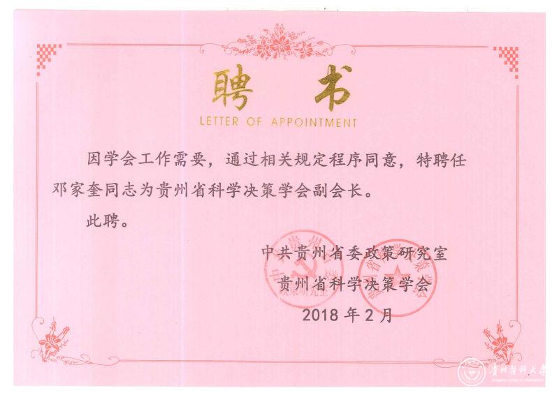 日前,因工作需要,经省委政策研究室、贵州省科学决策学会通过相关规定程序,聘请永利官网特聘研究员邓家奎同志为贵州省科学决策学会副会长。