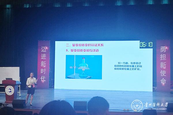 永利官网选手朱梅以“量变和质变的辩证关系”为题向莘莘学子展示了日益强大的祖国是通过不断的累积、进步才取得现在的辉煌,她用自己生动的讲解向我们诠释了什么叫“九层之台,起于累土”。最后,朱梅同学以87.13的优秀成绩获本次大赛三等奖,杨成兰老师获最佳指导教师称号,向各大高校展现了贵医风采。