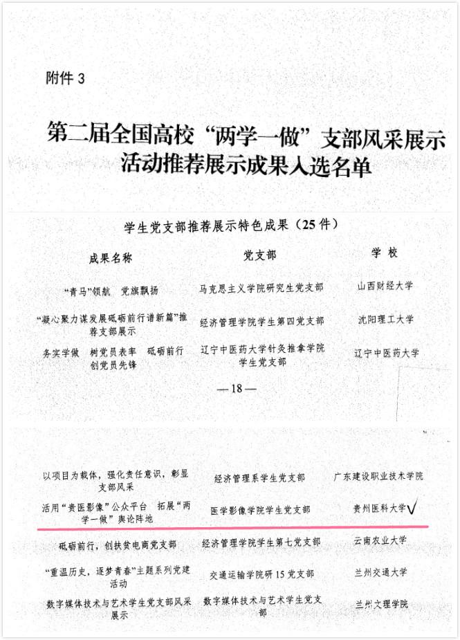 在教育部组织开展的第二届全国高校“两学一做”支部风采展示活动中,永利官网医学影像学院学生党支部的作品入选,并荣获“学生党支部推荐展示特色成果”殊荣。