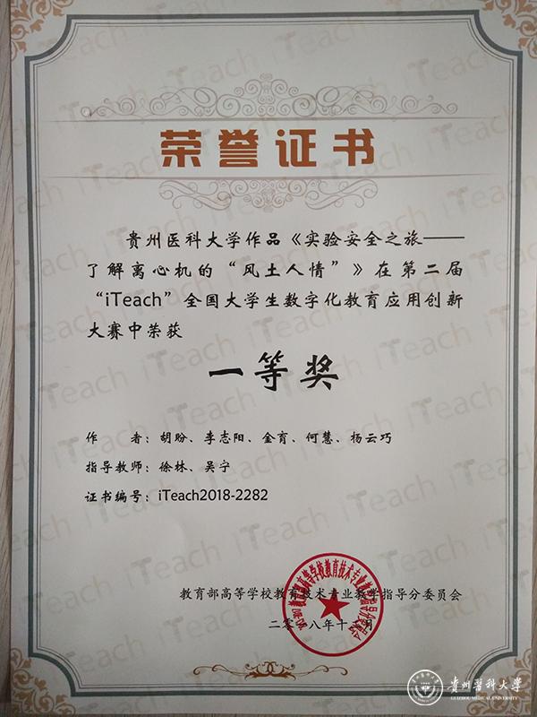 本次大赛由高等学校教育技术教学指导分委员会、华中师范大学主办。大赛以“信息化+教育应用+创新”为主题,旨在引领高校大学生关注教育发展、理解教育需求的同时,面向真实需求进行作品开发,通过学以致用的实践培养创新能力和合作意识,提高综合素质。参赛对象面向全国(含港、澳、台)普通高等学校的全日制在籍在读大学生。永利官网基础医学院吴宁、电化教学中心徐林老师指导选手胡盼、李志阳、金育、何慧、杨云巧的作品《实验室安全之旅—了解离心机的风土人情》进入决赛,并荣获一等奖。