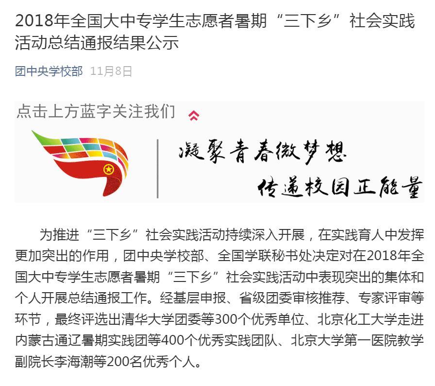 据悉,为推进“三下乡”社会实践活动持续深入开展,在实践育人中发挥更加突出的作用,团中央学校部、全国学联秘书处对在2018年全国大中专学生志愿者暑期“三下乡”社会实践活动中表现突出的集体和个人开展总结通报工作。经基层申报、省级团委审核推荐、专家评审等环节,最终评选出优秀团队。