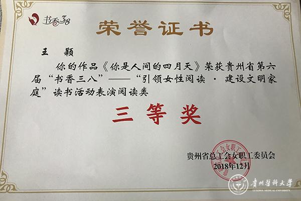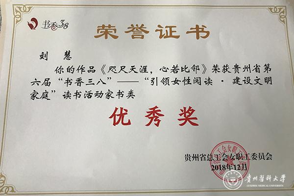 由省总女职工委员会举办的第六届“书香三八”——“引领女性阅读 • 建设文明家庭”读书征文活动评选揭晓。永利官网药学院王颖作品《你是人间四月天》荣获三等奖,基础医学院刘慧《咫尺天涯,心若比邻》荣获优秀奖。