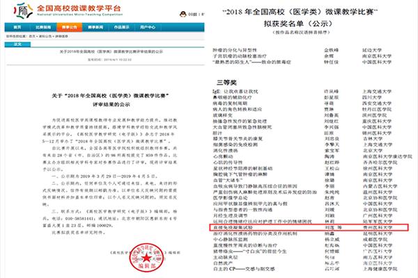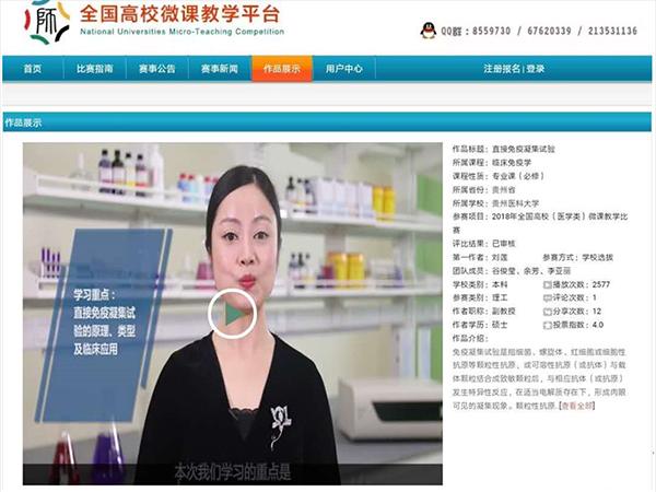 经过网评和组织学科专家终评,20%作品入围一、二、三等奖,永利官网医学检验专业临床免疫学刘莲副教授参赛作品“直接免疫凝集试验”(参与人:谷俊莹,余芳,李亚丽)获三等奖,是永利官网唯一入围等次奖项的作品,也是贵州省高校5项获等次奖项作品之一。微课是以视频为主要载体,记录教师围绕某个知识点或教学环节开展的简短、完整的教学活动。通过参加比赛不仅提升信息化教学技术运用能力,还激发教师更新教育理念、掌握现代教学方法的热情,切实推动教学模式改革,全面提高教学质量。