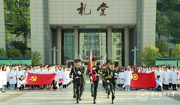 升旗仪式结束后,王之瑞在国旗下作题为《担当强国使命·成就青春时代》主题讲话。她以革命先烈李大钊的“以青春之我,创建青春之家庭,青春之国家,青春之民族,青春之人类,青春之地球,青春之宇宙,资以乐其无涯之生”和大家一起回顾了五四运动100年来中国青年外争主权,内除国贼,拯救民族危亡的中国革命历史。王之瑞希望,同学们要爱国,做一个心怀天下、有家国情怀的人;要励志,做一个志存高远、有理想信念的人;要求真,做一个实事求是、与时俱进的人;要力行,做一个脚踏实地、笃实力行的人;同时勉励同学们铭记“兴药为民”的时代责任,秉承“诚於己,忠于群,敬往思来”的校训,奉行“大医精诚”的精神,践行医学生誓词,立志成才,锐意进取,追梦奋斗,为药学院增光,为贵医争光,为国旗添彩,以实际行动和优异成绩庆祝祖国70华诞。