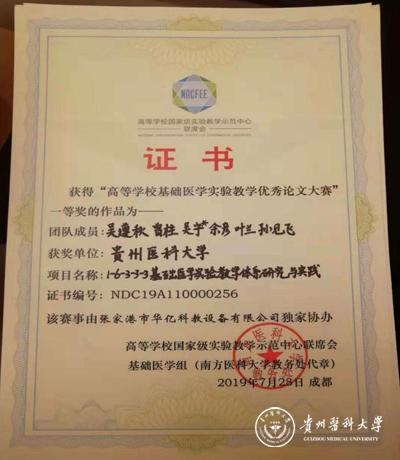 吴遵秋老师荣获“高等学校基础医学实验教学优秀论文大赛”一等奖