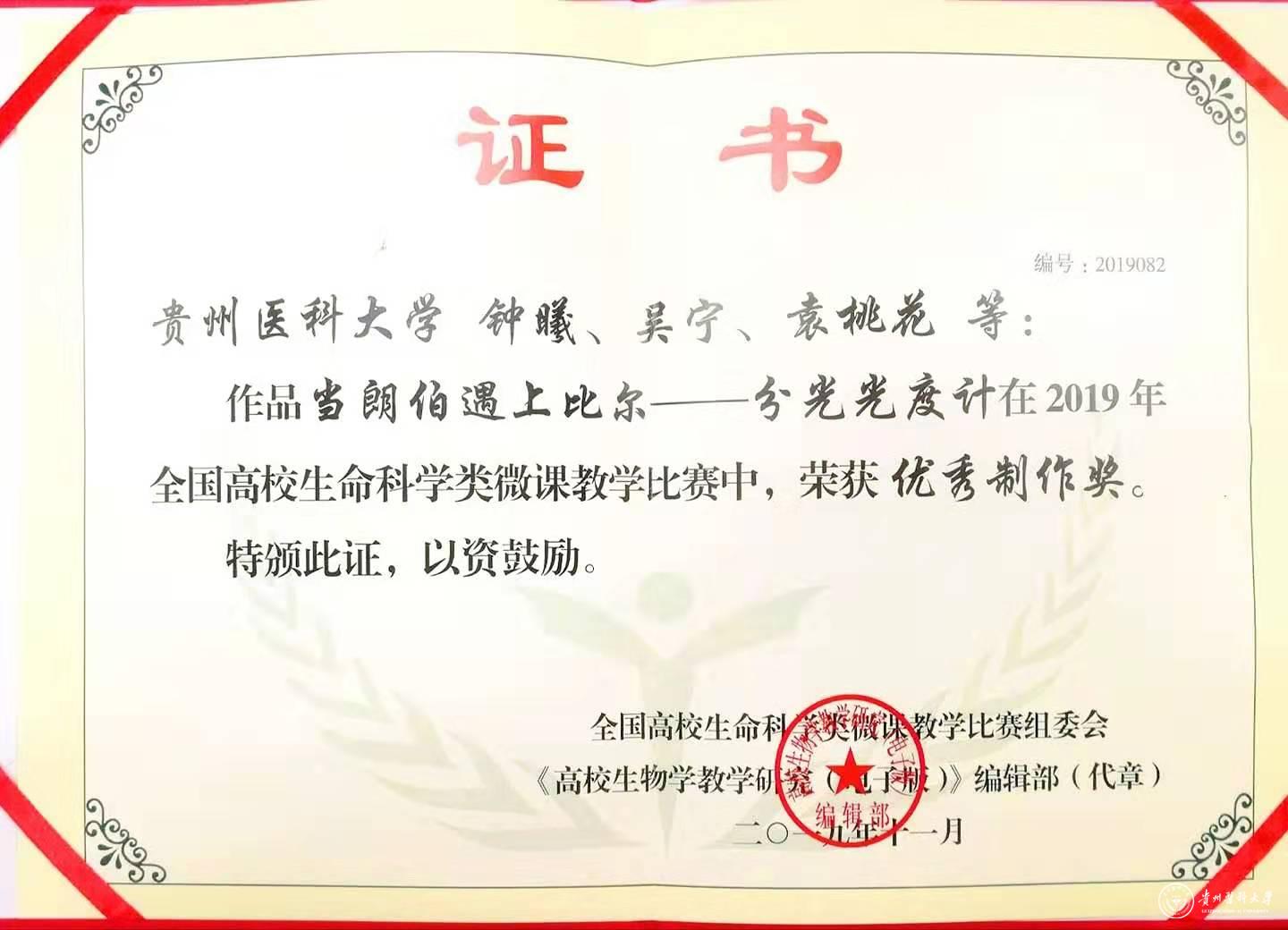大会对2019年全国高校生命科学类微课教学比赛获奖作品进行了表彰。永利官网基础医学院修江帆团队报送的作品“光学显微镜的结果和使用方法”,在比赛中荣获二等奖;吴宁团队报送的作品“当朗伯遇上比尔——分光光度计”获得优秀制作奖,展现了永利官网教师扎实的教学功底和良好的教学风貌。