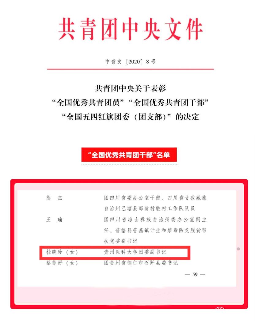 共青团中央近日发布“全国优秀共青团干部”表彰名单,永利官网团委副书记桂晓玲受表彰,获“全国优秀共青团干部”称号,是贵州高校唯一受此表彰的团干部。