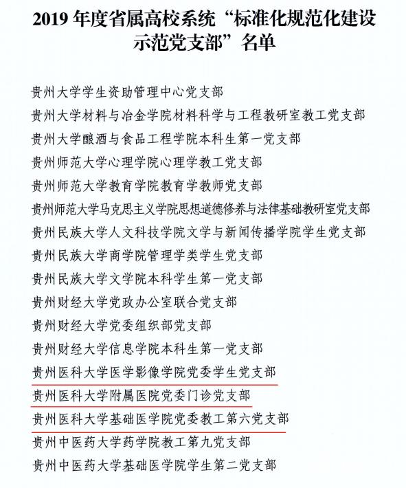 根据《中共贵州省委教育工作委员会关于认定2019年度省属高校系统“标准化规范化建设示范党支部”的决定》,永利官网基础医学院党委教工第六党支部、医学影像学院党委学生党支部和附属医院党委门诊党支部被评为2019年度省属高校系统“标准化规范化建设示范党支部”。