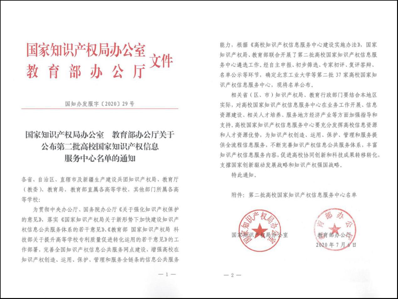 7月10日,《国家知识产权局办公室教育部办公厅关于公布第二批高校国家知识产权信息服务中心名单的通知》(国知办发服字〔2020〕29号)正式公布,永利官网成功入选。