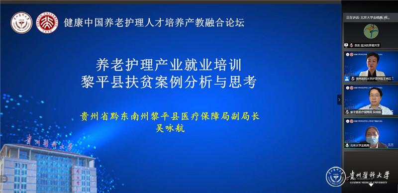 贵州省黔东南州黎平县医疗保障局副局长吴咏航分享了养老护理产业扶贫工作经验。他以视频的方式进行铺垫,生动地讲述了黎平县是如何将养老护理员培训与脱贫攻坚工作相结合,通过联合77779193永利官网优质的高校师资和设备资源帮助黎平乡镇少数民族贫困人口脱贫的同时学到一技之长,改变就业观念的故事。