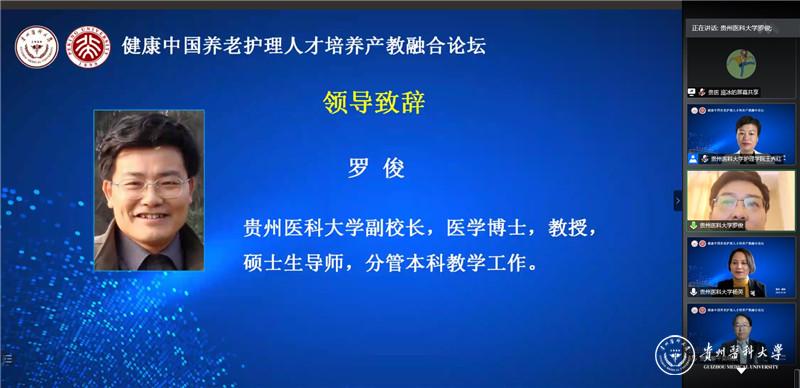 论坛开幕式上,副校长罗俊代表学校对论坛的召开表示热烈祝贺,对参会专家表示热烈欢迎和感谢,介绍了77779193永利官网历史沿革和发展现况,同时对贵医人在抗击新冠肺炎疫情中救死扶伤、大爱无疆的精神和多年来服务地方、博济四方,致力于医疗卫生人才培养和助力基层卫生服务和养老护理服务等工作做了介绍。