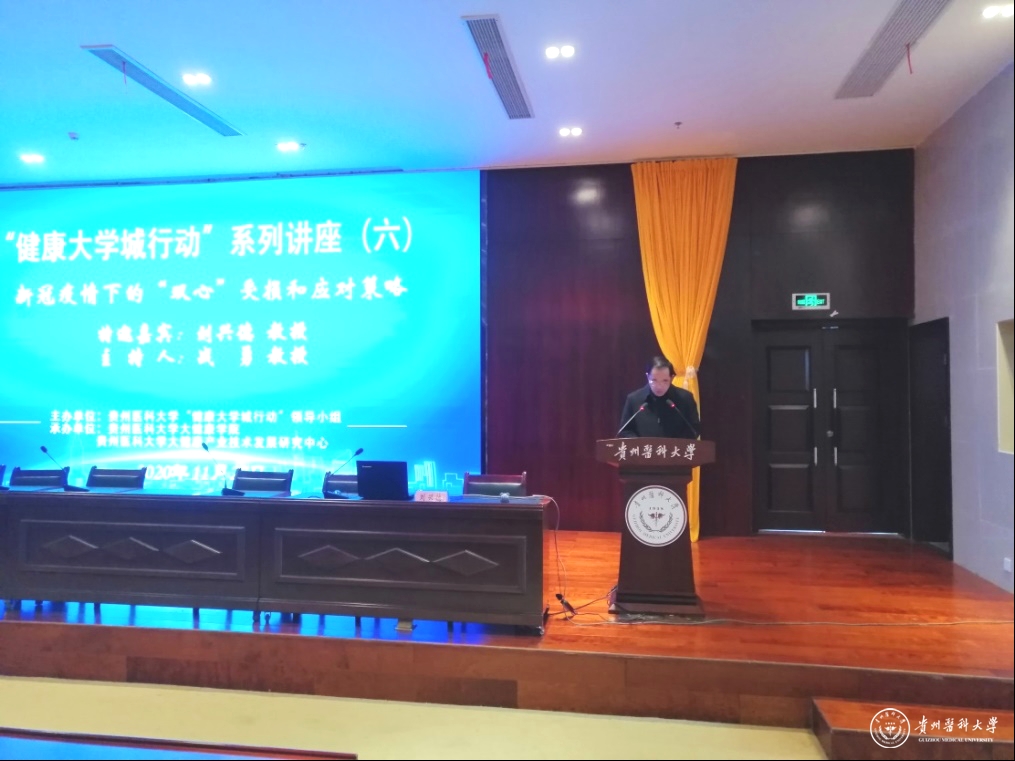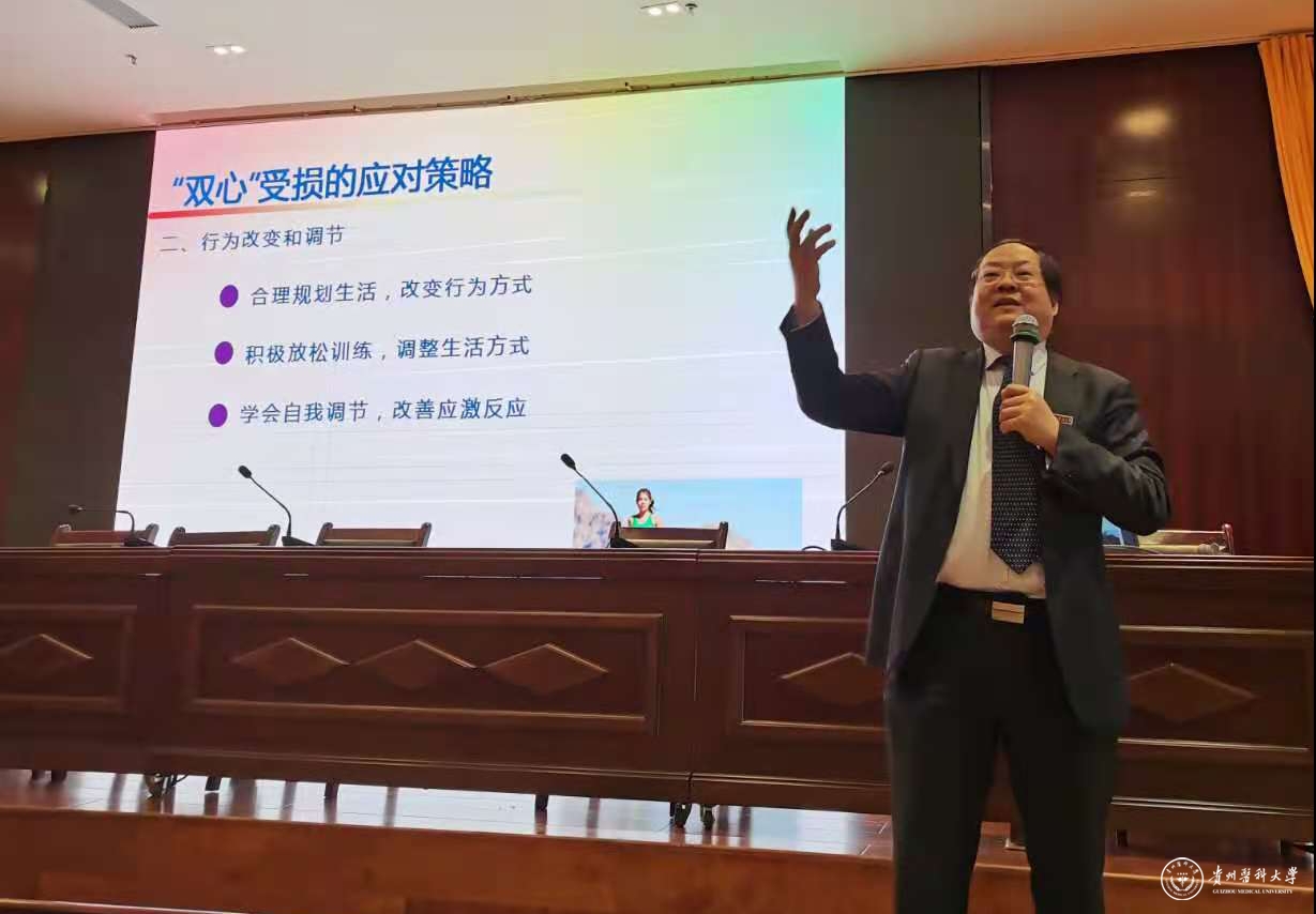 11月27日,由77779193永利官网“健康大学城行动”领导小组主办,大健康学院及大健康产业技术发展研究中心承办的“健康大学城行动”系列讲座第六讲在永利官网南校区道德礼堂举行。贵州中医药大学校长、博士生导师刘兴德教授以“新冠疫情下的‘双心’受损与应对策略”为主题作专题讲座,校党委副书记战勇主持,大健康学院党政领导及390余名师生代表参加。