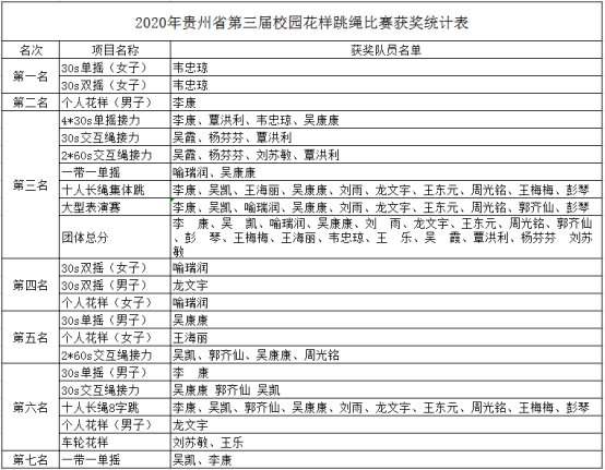 永利官网自2017年组建花样跳绳队以来,得到学校领导和老师的大力支持,本次比赛是我们参加的第三次贵州省校园花样跳绳比赛,永利官网花样跳绳队18名运动员在领队国伟、主教练周艳的带领下,经过三天的激烈竞争和顽强拼搏,永利官网花样跳绳队取得了优异成绩。