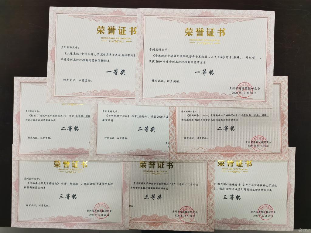 在2019年度贵州省高校校报好新闻评选中,张峰、马红超《贵医附院全球最先进的达芬奇手术机器人正式上岗!》获消息类一等奖,田珊、张厅厅《做工作的创造者》获通讯类一等奖,陈松江《传承》获新闻摄影类一等奖;杨韵、周颖《校园 | 传说中医学生的画来了》获新媒体类二等奖;胡佳欣《网络暴力不是言论自由》获言论类三等奖;白夏蔓、姚祖欢、张厅厅、王家锴、杜思影获“优秀学生记者”称号。