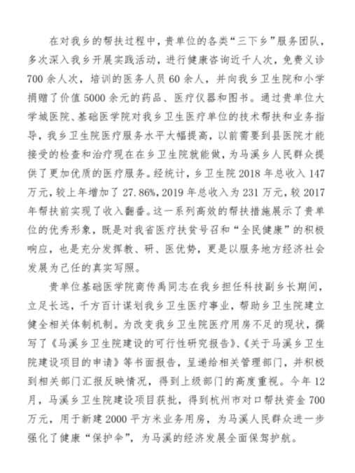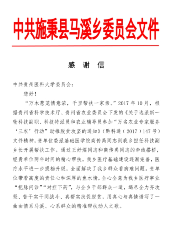 2017年10月,根据贵州省科学技术厅、贵州省农业委员会下发的《关于选派新一轮科技副职、科技特派员和农业辅导员参加“万名农业专家服务‘三农’行动”助推脱贫攻坚的通知》(黔科通﹝2017﹞147号) 文件精神,学校党委委派基础医学院骨干教师商传禹同志到马溪乡挂职科技副乡长,扎根一线,带领群众脱贫致富。通过两年精心帮扶,马溪乡医疗基础建设逐渐完善,医疗水平进一步提升,全面解决了群众看病难问题。2018年马溪乡助力施秉县实现整县脱贫出列,2019年实现了贫困村与贫困人口“双清零”,2020年顺利通过国家脱贫普查验收,2021年马溪乡卫生院建设项目获批,2000平方米业务用房的新建得到杭州市对口帮扶资金700万元,为全乡人民群众进一步坚固了健康“保护伞”,为马溪乡医疗事业发展打下坚实基础。