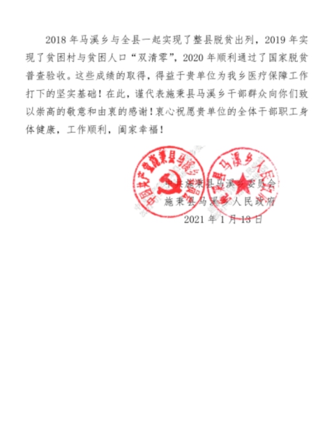 近日,学校党委收到施秉县马溪乡党委、乡政府寄来函,感谢永利官网长期以来对马溪乡脱贫攻坚工作给予的大力支持。