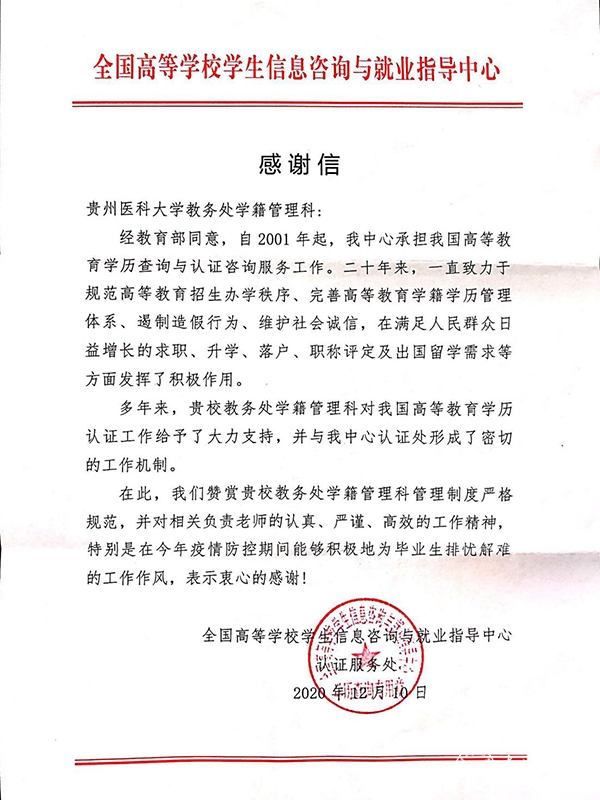 全国高等学校信息咨询与就业指导中心(“教育部学历认证中心”)特发信,表示感谢。信中写到,多年来,贵校对我国高等教育学历认证工作给予了大力支持,并与中心认证处形成了密切的工作机制。信里赞赏永利官网管理制度严格规范,对相关负责老师的认真、严谨、高效的工作精神,特别是2020年以来,在疫情防控期间能够积极为毕业生排忧解难的工作作风,表示衷心的感谢!