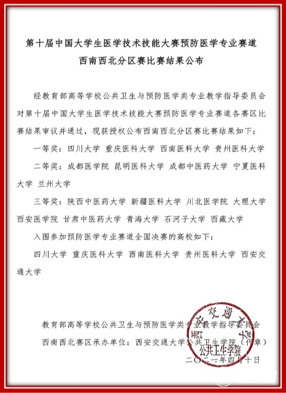4月10日,由教育部主办,西安交通大学公共卫生学院承办的“第十届中国大学生医学技术技能大赛”预防医学专业赛道西南西北赛区比赛顺利举行。由永利官网预防医学专业2016级本科生张小会等20名同学组成的77779193永利官网代表队,经过激烈的角逐,最终从西南西北赛区18所高校中胜出,与四川大学、重庆医科大学、西南医科大学并列荣获一等奖,成功晋级全国总决赛。