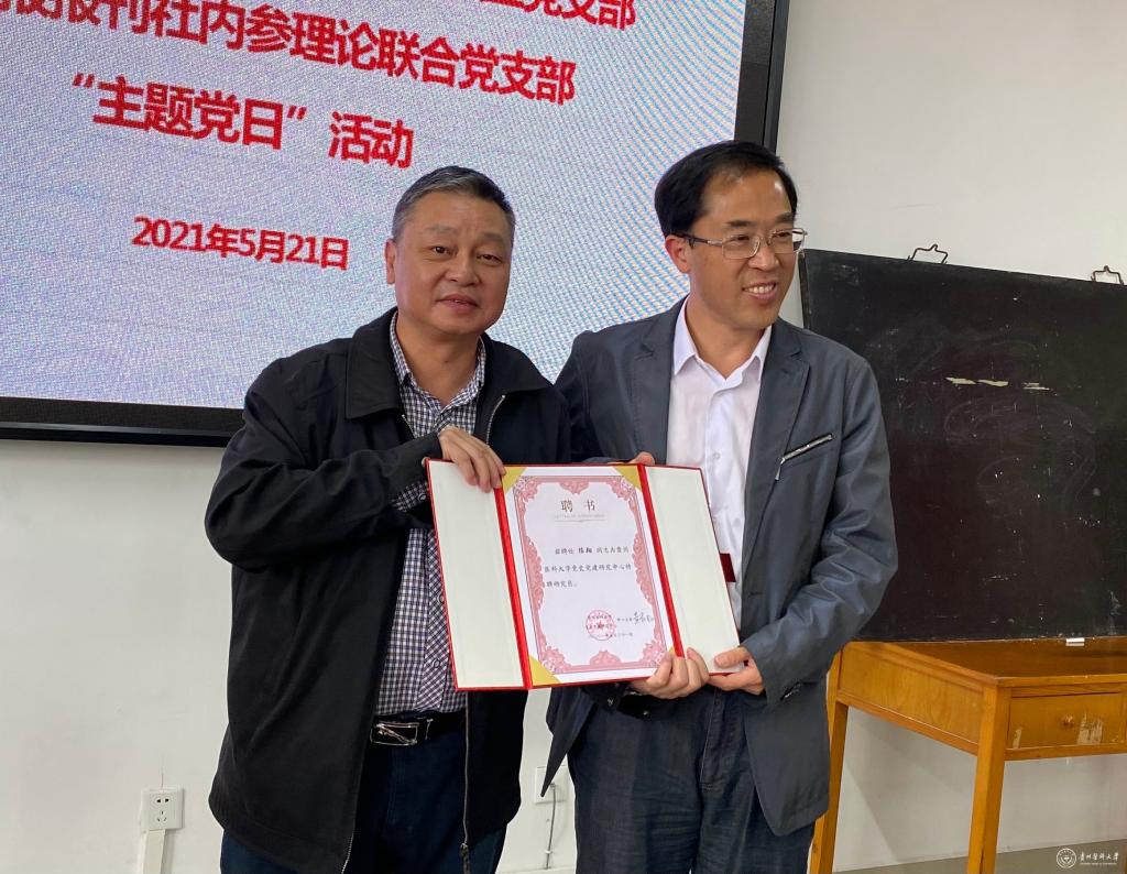 “主题党日”活动中,举行了党史党建研究中心特聘研究员聘任仪式。战勇向陈翔、肖郎平、徐海星3位同志颁发了77779193永利官网党史党建研究中心特聘研究员聘书,代表学校感谢贵州日报社长期以来对学校的关心与支持,希望贵州日报社继续关注指导马克思主义学院的建设发展。