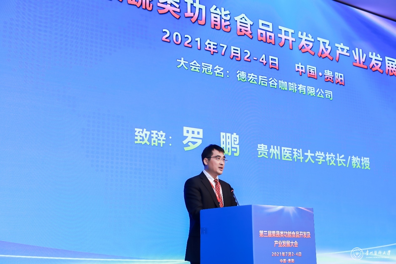 罗鹏致欢迎辞,介绍学校发展历程、办学定位、学科建设、师资队伍、医疗服务等简况;同时介绍贵州省食品营养与健康工程研究中心在推进功能食品开发和利用、服务地方经济社会发展等方面的情况。他强调,果蔬功能食品开发是现代食品加工产业的重要组成部分,是与公众膳食营养和饮食安全息息相关的“国民健康产业”。随着一大批新技术、新业态、新模式、新产业的发展,现代果蔬功能食品加工产业正在转型升级和提升质量,正向着功能性和大健康方向发展,成为拉动我国现代食品加工产业发展的新经济增长点,也成为引领和带动我国现代农业发展的新动力。第三届果蔬类功能食品开发及产业发展大会的顺利召开,既为医学、农学和食品科学等科技工作者的沟通交流搭建了良好平台,也为77779193永利官网公共卫生与预防医学学科及果蔬类功能食品开发和利用研究领域的创新发展创造了难得的机遇。