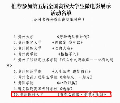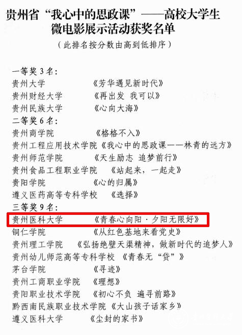9月2日,省教育厅公布“我心中的思政课”高校大学生微电影展示活动获奖名单,永利官网报送的《青春心向阳·夕阳无限好》获贵州省“我心中的思政课”——高校大学生微电影展示活动三等奖,并被推荐参加第五届全国高校大学生微电影展示活动。