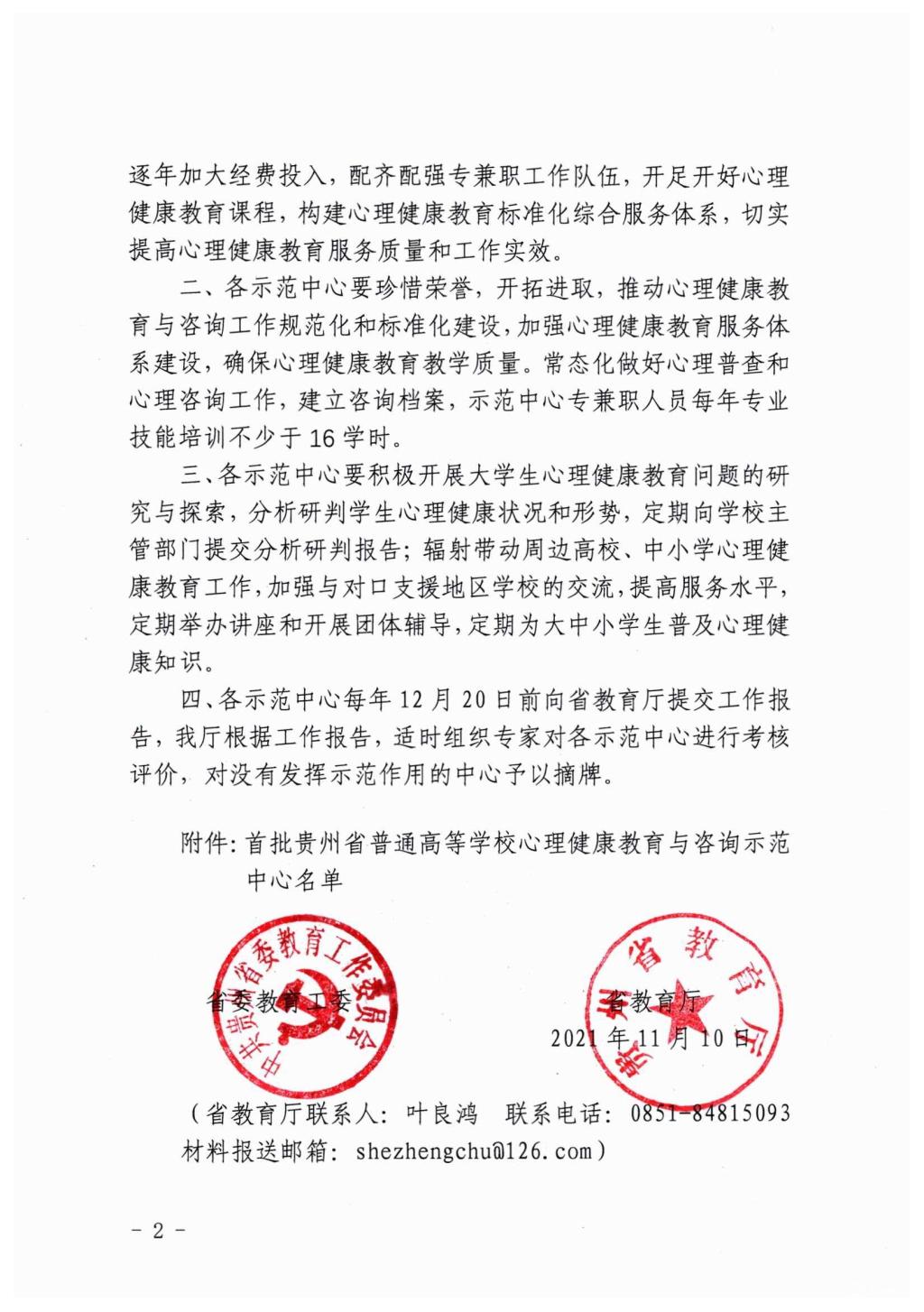 11月10日,省委教育工委、省教育厅下发了《省委教育工委省教育厅关于公布首批贵州省普通高等学校心理健康教育与咨询示范中心名单的通知》(黔教(委)函〔2021〕13号),永利官网获批贵州省普通高等学校心理健康教育与咨询示范中心。