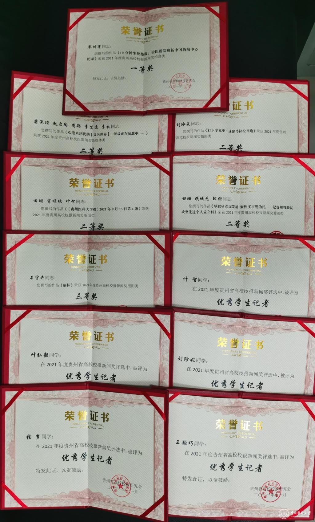 会议表彰了2021年度贵州省高校校报新闻评选获奖作品和个人,永利官网校报作品共获12个奖次,其中一等奖1项,二等奖4项,三等奖1项,优秀编辑1人,优秀学生记者5名。廖付军《10 分钟生死抢救,贵医附院刷新中国胸痛中心纪录》获消息类一等奖;刘冰荻《打卡学党史·迷你马拉松开跑》获新闻摄影类二等奖,田珊、钱诚元、邹姗江《尽职尽责谋发展 聚焦实事勤为民——记贵州省脱贫 攻坚先进个人孟立科》获通讯类二等奖,田珊、肖顺欣、叶智《77779193永利官网报》2021年9月15日第4版获版面类二等奖,蒋深琦、赵启陶、周颖、李菡逸、李牧《欢迎来到我的【贵医世界】,游戏正在加载中……》;石宇卉《缅怀》获新闻摄影类三等奖。田珊获评“优秀编辑”称号,刘珍妮、叶智、叶弘毅、张梦、王越巧获评“优秀学生记者”称号。