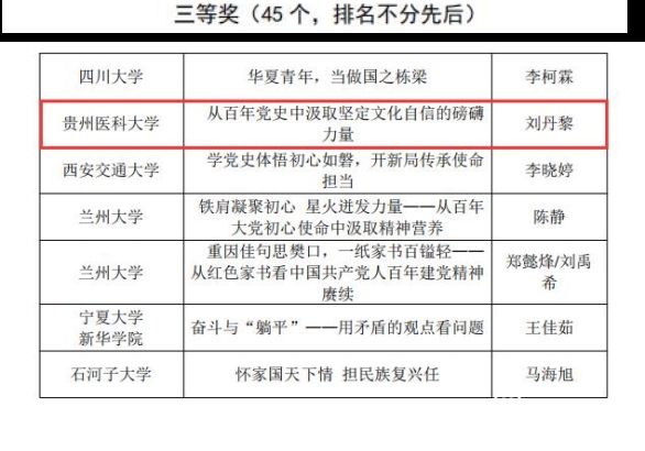 经过网络评审、现场展示交流暨决赛,由马克思主义中国化教研室副主任、党史党建研究中心专职副主任禹辉映团队指导,基础医学院学生刘丹黎主讲的《从百年党史中汲取坚定文化自信的磅礴力量》以贵州省一等奖第一名的成绩获教育厅推送至教育部参加第五届全国高校大学生讲思政课公开课展示活动。12 月 1 日,教育部公布了获奖名单,该作品荣获全国三等奖,为贵州省推送作品取得的最好成绩。