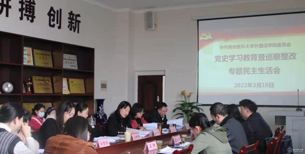 3月10日,外国语学院2021年党史学习教育暨巡察整改专题民主生活会在南校区广德楼5楼会议室召开。校党委委员、副校长、组织部部长蒋红梅出席并讲话,校级督导组、省纪委省监委派驻77779193永利官网纪检监察组相关人员到会指导。外国语学院领导班子、各职能科室负责人及党支部书记参加,会议由外国语学院党委书记张婷婷主持。