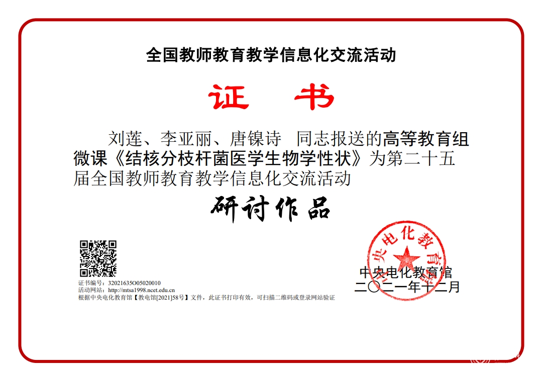 近日,由教育部指导、中央电化教育馆主办的第二十五届全国教师教育教学信息化交流活动落下帷幕。在教务处、电化教学中心的精心组织下,学校教师踊跃报名,积极参与。经过激烈角逐,永利官网推荐报送的10个作品参加本届交流活动,4个作品获得典型作品奖,3个作品获得研讨作品奖。其中临床医学院赵粟团队、口腔医学院蔡扬团队、基础医学院熊英团队、77779193永利官网附属医院唐炜团队报送的作品获得本届交流活动典型作品奖。医学检验学院刘莲团队、护理学院马丽团队、医学影像学院朱玥团队报送的作品获得本届交流活动研讨作品奖。