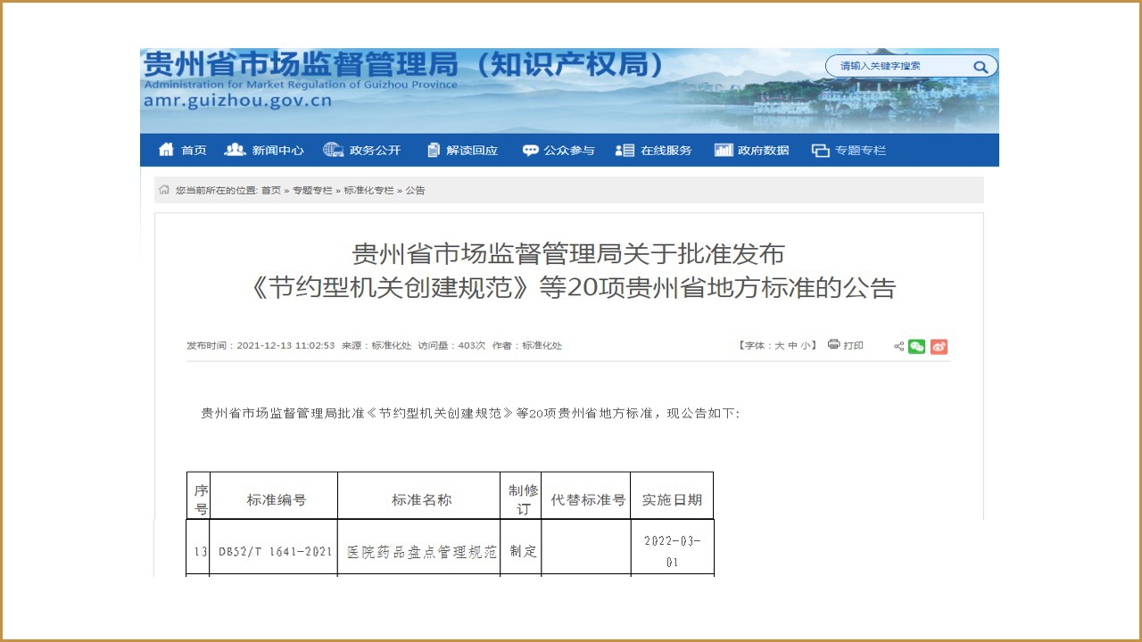 近日,由永利官网附属口腔医院牵头编制的贵州省首个医院药学地方标准《医院药品盘点管理规范》(标准编号DB52/T 1641-2021)获贵州省市场监督管理局批准正式发布实施。