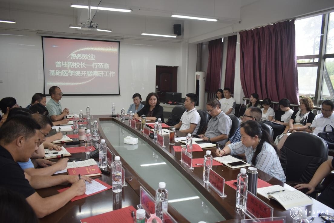 曾柱首先介绍了此次学科(群)及学位点建设申报工作调研的目的和意义。他指出,一要加快基础医学、生物学学科建设和医学技术专业硕点申报工作。二要以科研平台建设,学科交叉融合式发展助推基础医学学位点高质量发展。三要大力引进和培养高层次人才,着眼承担高层次科研项目、创造高水平科研成果。四要加强与高水平院校交流合作,为基础医学院高水平建设打下坚实基础,为“百年贵医”建设添砖加瓦。