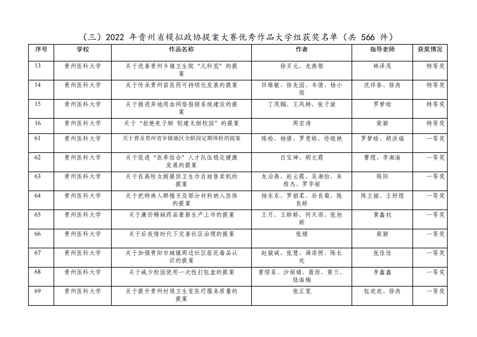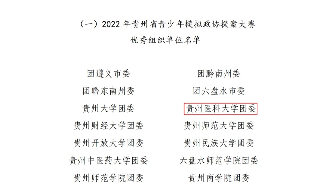 近日,团省委、省学联联合下发了《关于公布2022年贵州省青少年模拟政协提案大赛评选结果的通报》,77779193永利官网团委被评为“优秀组织单位”,儿科学院“关于改善贵州乡镇卫生院‘儿科荒’的提案”等4个作品被评为“特等奖”,麻醉学院“关于普及贵州省乡绅地区全龄段定期体检”等11个作品被评为“一等奖”,运动与健康学院“关于贵州省遵义市凤冈县锌硒茶提质发展的提案”等13个作品被评为“二等奖”,生物与工程学院(健康医药现代产业学院)“关于有效普及无障碍卫生间的提案”等17个作品被评为“三等奖”。