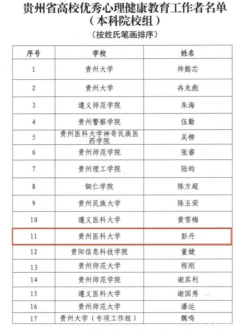 近日,省教育厅公布了2022年度贵州省高校优秀心理健康教育工作者评选结果,永利官网大学生心理健康教育与咨询中心副主任兼医学人文学院副院长彭丹获“2022年度贵州省高校优秀心理健康教育工作者”荣誉称号。