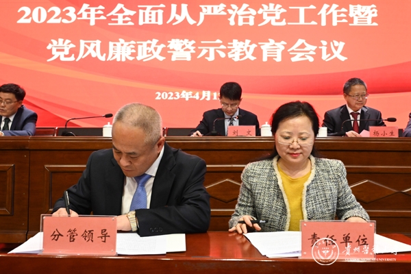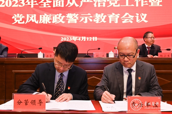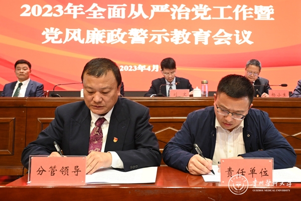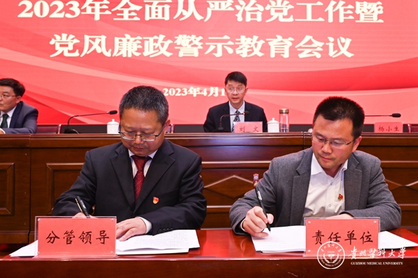 4月12日,学校2023年全面从严治党工作暨党风廉政警示教育会议在花溪校区道德讲堂召开。校领导刘文、罗俊、田晓滨、陈代勇、李海洋、沈祥春及校党委委员陈颖,天产室领导杨小生、孙超出席。学校(含天产室)党政群各部门副处级以上干部,各附属医院党政主要负责人、纪委书记,省纪委省监委派驻学校纪检监察组全体干部参加。会议由党委副书记刘文主持。